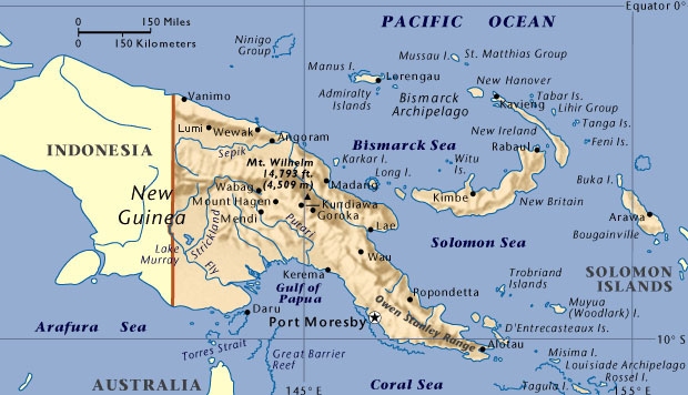 Geografisch ist Neuguinea schwieriges Terrain. Ein bis 5000 m hohes Gebirge teilt die Insel in west-östlicher Richtung und tiefe Einschnitte stellen kaum zu überwindende Hindernisse dar. In dieser Umgebung hatten die einheimischen Papuas wenig Kontakt zu ihren Nachbarn. Man schätzt, dass es alleine in Papua Neuguinea bis zu 700 verschiedene Sprachen gibt. Wantoks ("One Talk"), also Angehörige einer gemeinsamen Sprache, halten eng zusammen. Mit den Fremden, die eine andere Sprache sprechen, kommuniziert man in Pidgin, eine aus dem Englischen abgeleitete Sprache, die aber auch malayische, polynesische und vereinzelte deutsche Wörter enthält.